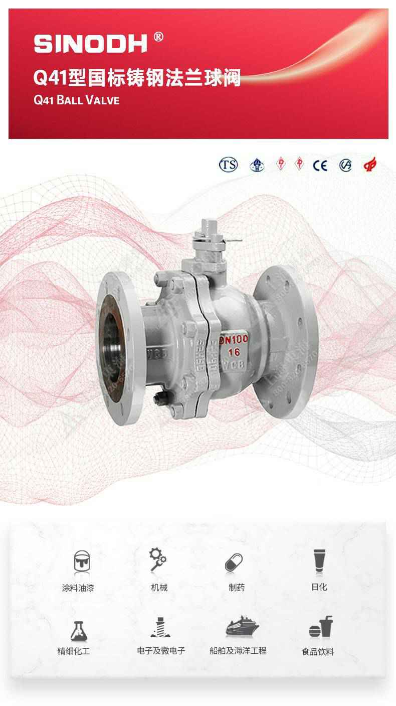 Q41型国标铸钢法兰球阀,为重庆夏宇文化交流培训有限公司自主研发生产。本产品设计制造标准符合GB/T12237、GB/T12224标准。该产品的球体在介质压力作用下球体能产生一定的位移并紧压在出口端的密封面上,保证出口端密封。适用于水、溶剂、酸和天然气等一般工业介质也适用于工况恶劣的介质,如氧气、过氧化氢、甲烷和乙烯等介质。